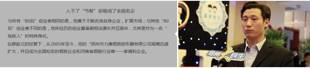 鄭州市力康假肢矯形器有限公司(簡稱力康),是一家專業(yè)從事假肢矯形器的設(shè)計、研發(fā)、制作及裝 配的專業(yè)機(jī)構(gòu)。成立于1992年是河南省唯一一家福利企業(yè)。力康下設(shè)業(yè)務(wù)部、技術(shù)部、住院部、康復(fù) 部、售后服務(wù)部,并配有現(xiàn)代化的裝配車間和功能齊全的訓(xùn)練大廳,為殘疾朋友康復(fù)訓(xùn)練提供了可靠 保障。總經(jīng)理穿戴假肢多年,有著豐富的臨床經(jīng)驗和親身體會;多年來,力康已為全國幾十萬名殘疾 朋友安裝上舒適、美觀、耐用的假肢和矯形器具,使他們更大限度地恢復(fù)了正常的工作和生活?!爱a(chǎn) 品即人品”的質(zhì)量理念、先進(jìn)的技術(shù)、實惠的價格、完善的售后服務(wù)是力康取勝的法寶……